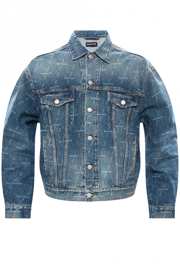 Balenciaga藍色牛仔夾克。這款夾克採用紐帶開合,飾有白色品牌標誌圖案、橙色縫線細節、兩個插袋和兩個帶紐帶的翻蓋口袋。