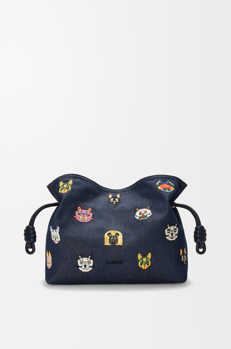 這款弗拉明戈手拿包造型柔軟慵懶,採用束口設計,並飾以復古的繩結抽繩。中型款式採用牛仔布料,飾以遍佈全身的貓咪刺繡圖案。這款包的設計靈感源自路易斯韋恩的「未來主義貓」瓷瓶系列。