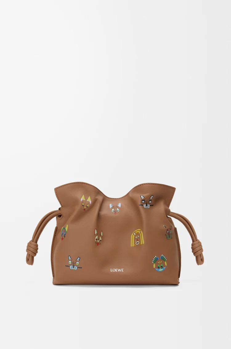 這款弗拉明戈手拿包造型柔軟慵懶,採用束口設計,並飾有復古的繩結抽繩。這款迷你版採用納帕小牛皮製成,並飾有立體貓咪印花。