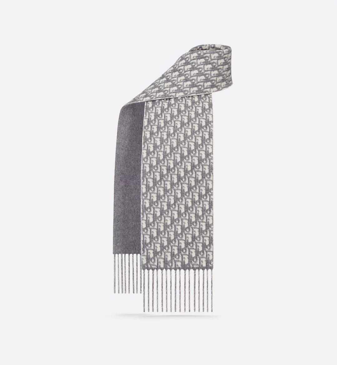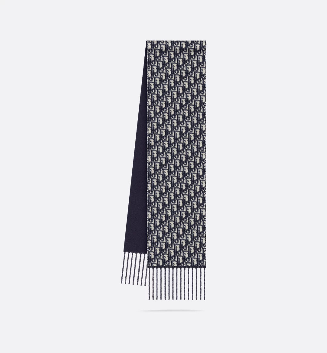 這款 Dior Oblique 頸巾是 2026 度假系列新品,呈現品牌自 1969 年起沿用至今的經典主題圖案。此雙面設計以海軍藍/灰色羊絨製成,一面為純色,另一面為 Dior Oblique 主題圖案。此頸巾可以圍在頸上,也可以隨意披掛在肩上。