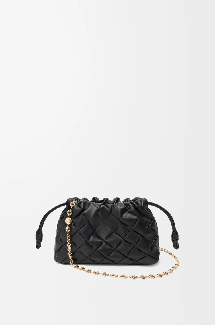 Flamenco Purse 輕盈柔軟,採用褶皺造型,並飾有歷史悠久的抽繩繩結。此迷你版本採用壓紋印花小牛皮製成,配有迷你甜甜圈鍊帶,可透過內部 D 形環對折。