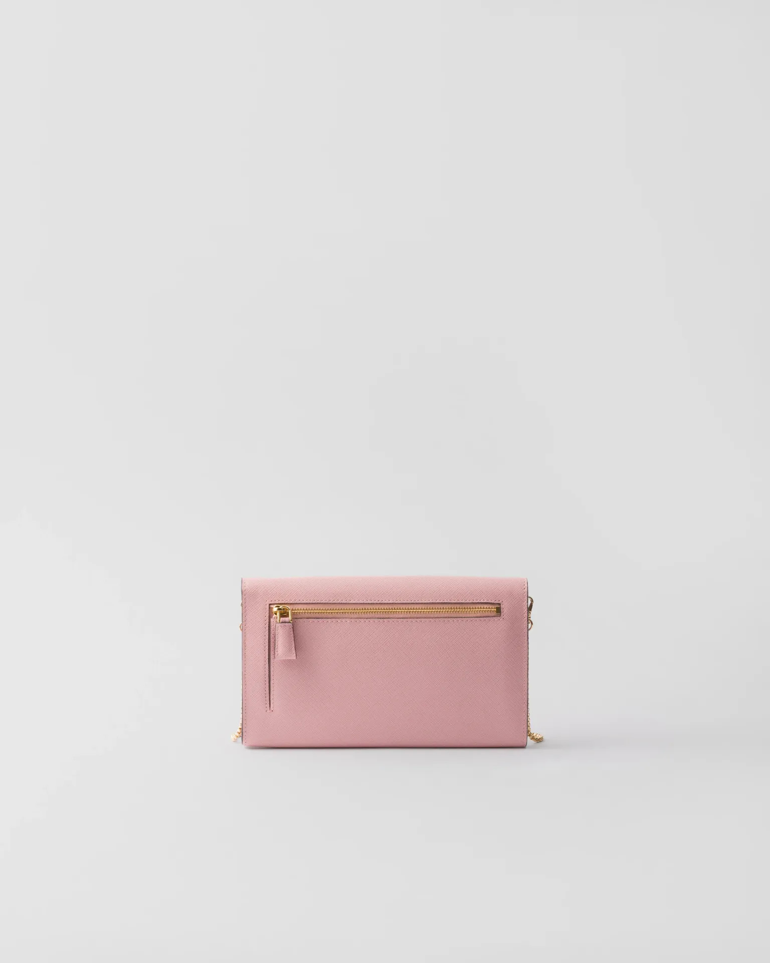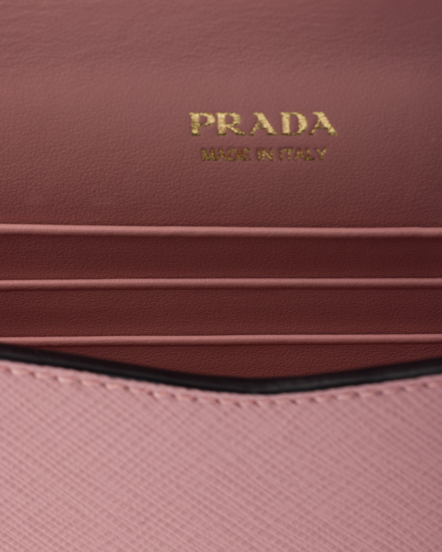 這款迷你包採用Saffiano皮革標誌性的十字紋理,展現高貴氣質。流暢的線條與Prada經典元素巧妙融合,打造出精緻優雅的配件。包身正面扣環和肩帶上均飾有標誌性的三角形圖案,格外引人注目。