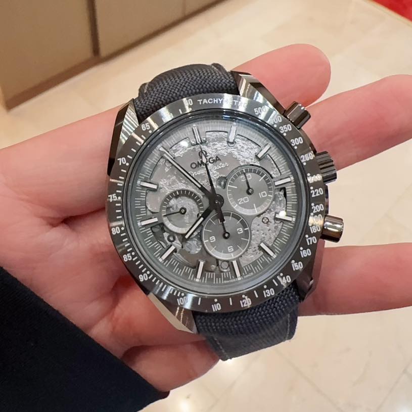 這款超霸Grey Side of the Moon 腕表向歐米茄的太空探索歷史致敬。直徑44.25毫米表殼以光面-磨砂灰色陶瓷鑄造,經等離子處理,磨砂表圈同樣採用灰色陶瓷材質,綴飾經白色夜光塗層處理的鐳射蝕刻測速計刻度。