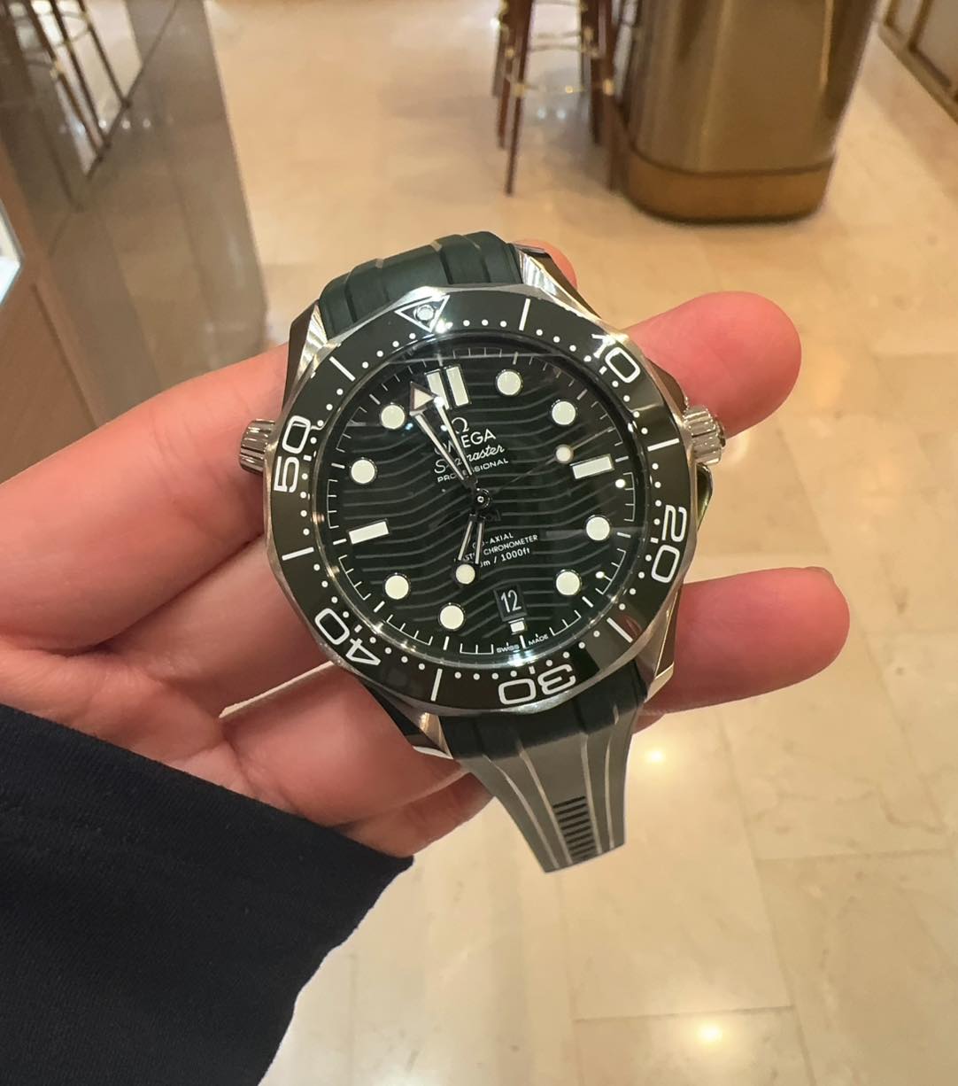 這款潛水腕表配襯綠色橡膠表帶,內置歐米茄Master Chronometer機芯8800,通透的波浪狀飾邊藍寶石水晶表背可一覽機芯的形態。