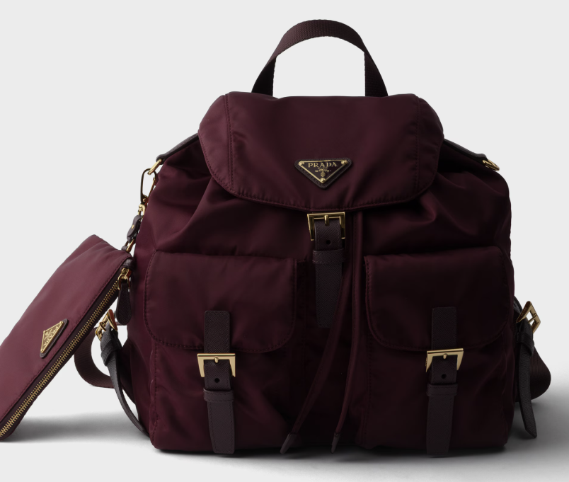 品牌經典背包薈萃多種時尚雋永的素材,底部選用由Prada標誌性工業面料演變而成的環保再生尼龍,並綴有Saffiano皮革細節。經典搪瓷金屬三角形標誌每季均以時尚設計重塑,現點綴正面。