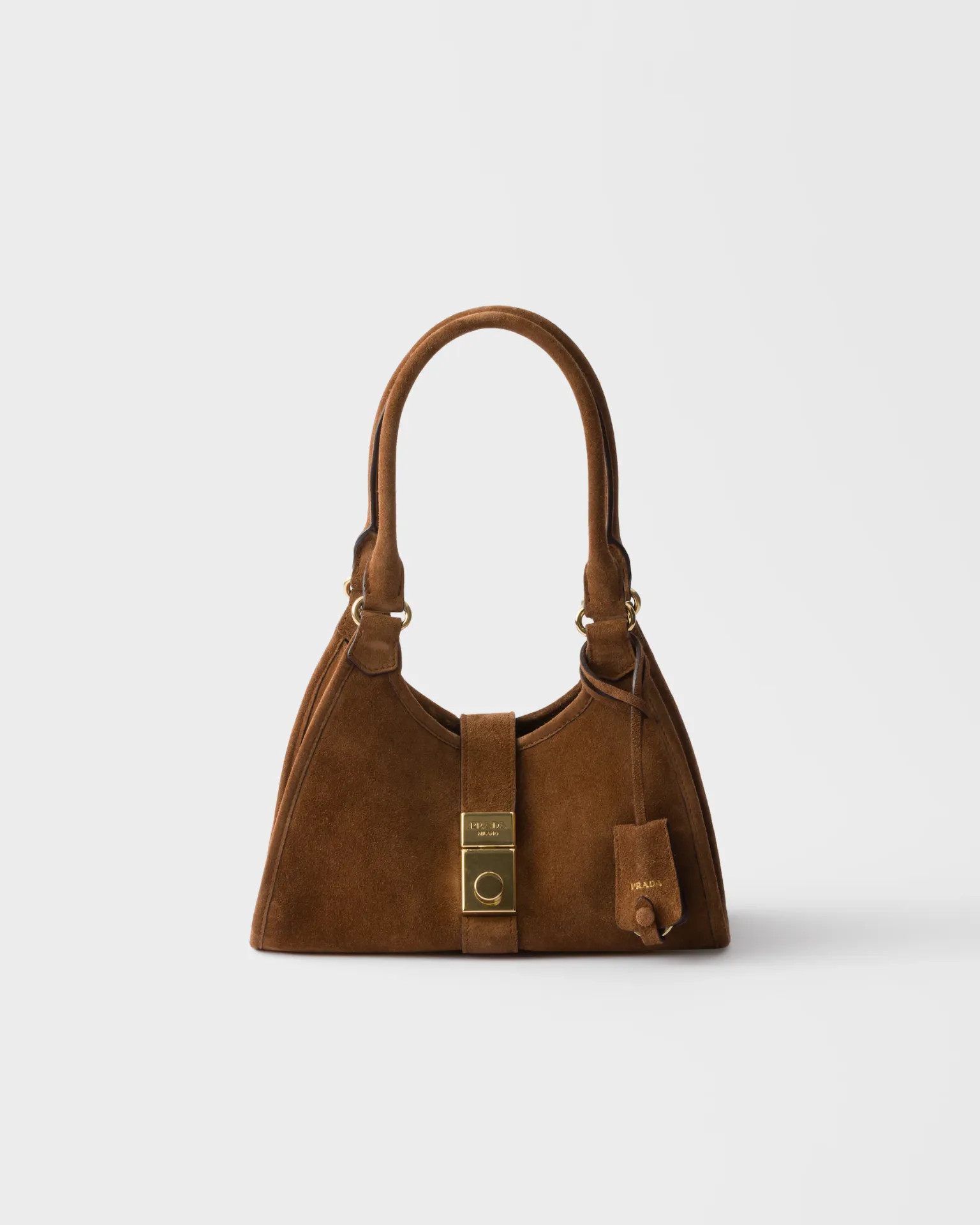 這款麂皮包以幾何線條和精緻的工藝細節勾勒出柔和的輪廓。梯形輪廓搭配加長手柄,方便手提或單肩背。源自品牌歷史檔案的垂直扣環和皮革鏡盒,為這款配件增添了一抹優雅氣息。